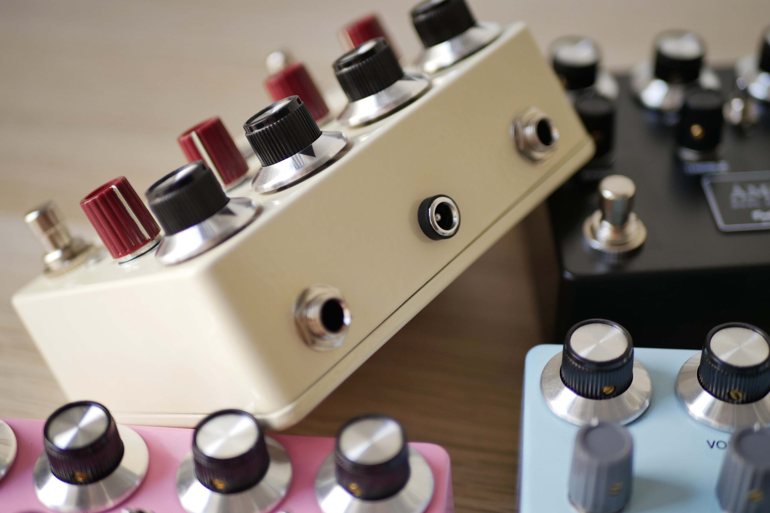 The amber side of the ÁMBAR pedal is based on the Klon Centaur circuit, but we’ve made some key refinements. One key addition is the BASS potentiometer, allowing you to adjust the bass frequencies for better adaptability with different guitars and setups. This control is particularly useful since the Klon can sometimes be too deep with some gear when used as a boost or too weak when set to distort. For stock Klon tones, just keep the BASS pot centered at 12:00.